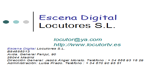Locución de anuncios en inglés / Locuciones de cuñas y spots de televisión por locutoras internacionales / Locutores españoles de publicidad, audio, vídeo y multimedia / Locutoras españolas internacionales / Diales cantados de emisoras de radio / Teléfonos cantados/ spots de televisión con fondos musicales / Cuñas publicitarias para radio y megafonía de centros comerciales / Producción y realización de programas de radio musicales, radiofórmula y culturales/ Grabación de "listas de éxitos musicales" para emisoras / Locuciones y locución de publicidad y de indicativos/ Jingles no cantados con efectos de sonido/ Cuñas para captar anunciantes para la emisora de radio/ Presentación de programas de radio y de televisión / Presentaciones nacionales e internacionales de locutores / Formulario de contacto para participar en la página web/ Locuciones gratuitas/ Descargas gratuitas de jingles y diales / Voces para cuñas de publicidad / Producciones españolas de radio y de televisión de diferentes cuñas y spots/ Jingles cantados de frecuencias/ Locución de teléfonos y de mensajes de empresas / Canciones y poemas particulares para regalar en bodas o cumpleaños/ / Sintonías de programas e informativos de radio y de televisión/ Guiones de programas para radio y televisión/ Presentaciones con efectos de sonidos/ Creación y redacción de Indicativos de emisoras / Locuciones de spots por locutores españoles, ingleses, franceses, portugueses, alemanes / Grabaciones de cursos formativos de calidad para empresas/ Doblaje de vídeos de empresas, dvds corporativos y de documentales / Dobladores españoles e ingleses de vídeos de empresas e institucionales/ Locución de audiolibros/ Dobladores de televisión, radio y de spots/ Locutor español y locutora española de doblaje y de cuñas comerciales / Locutoras de España / Locutores nativos ingleses / locutoras británicas/ locutores franceses, portugueses/ Grabaciones profesionales de locutores y locutoras catalanas/ locutora rusa/ presupuesto y tarifa de nuestros locutores españoles y extranjeros rofesionales/ Clientes y campañas publicitarias realizadas/ método de trabajo y garantías/ Algunos datos sobre nosotros / Algo sobre nuestro curriculum y experiencia profesional.